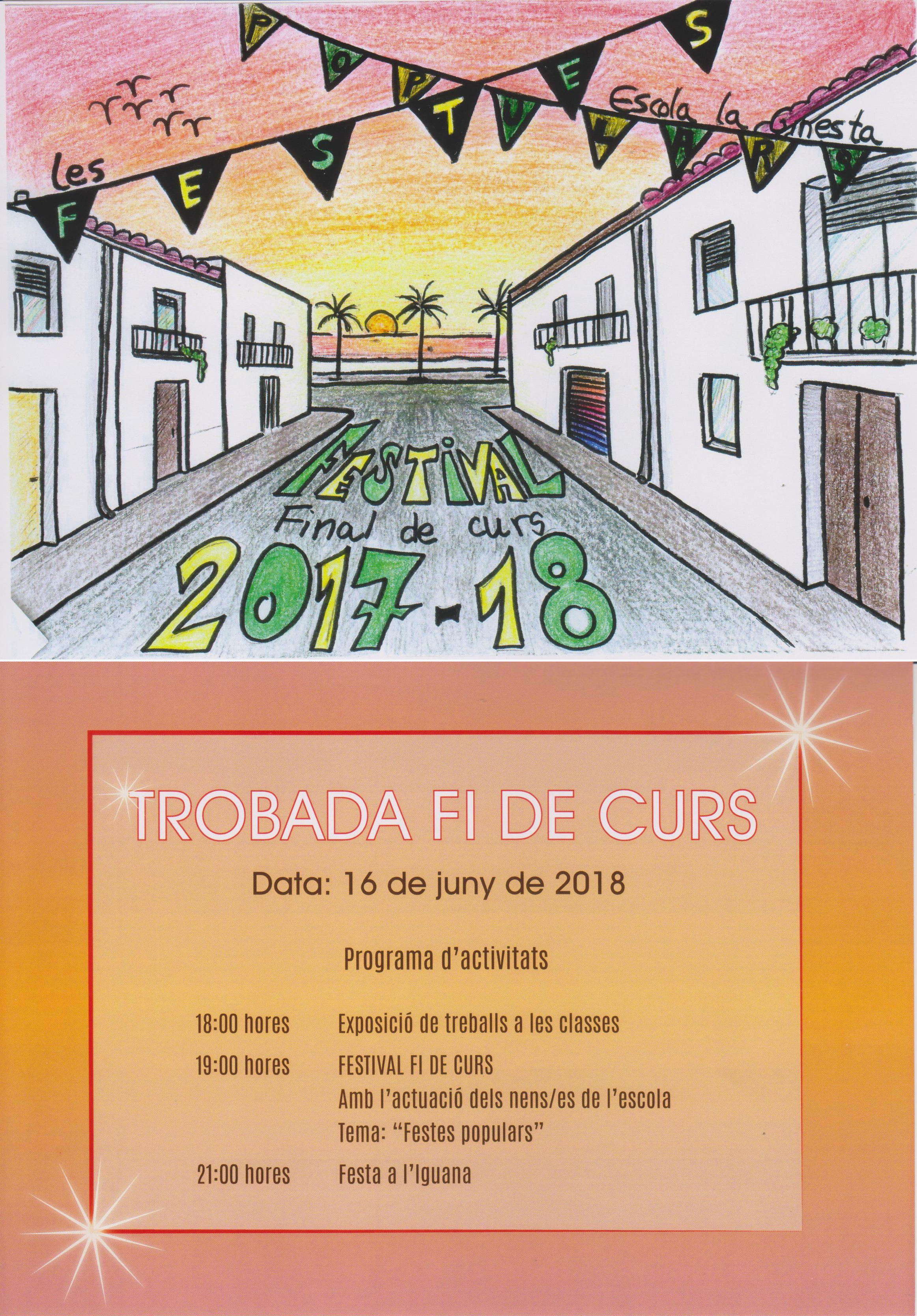 Ens plau informar-vos que el Festival Final de Curs d'enguany serà el dia 16 de Juny a les 18:00h (Exposició de treballs a les diferents classes) i a les 19:00h Festival amb l'actuació dels nens i nenes de l'escola.